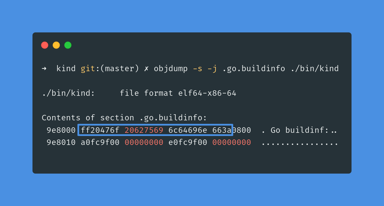 ➜ kind git:(master) ✗ objdump -s --start-address 0x007d02f5 --stop-address 0x007d02fb ./bin/kind